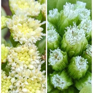 里山お散歩♪ 今日のお散歩ではフキノトウの雌花と雄花の両方を見つけました。 フキ(蕗)は雌雄異株です。 マクロレンズを使って雄雌の違いがわかりやすいpicになりました😄👍 写真右側縦一列が雄花です。 1つ1つの小さな花が星形で全体的に見ると黄色っぽいです。 花が終わるとやがて枯れます。 写真左側縦一列が雌花です。 歯ブラシのようなお花で全体的に見ると白いです。 受粉すると綿毛になりフワフワとタンポポの綿毛のように風にのって飛んでいきますヨ〜🌬