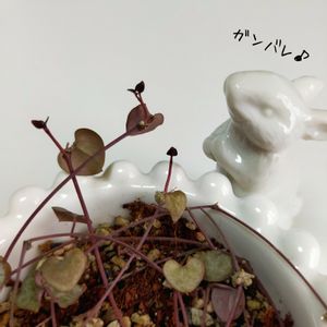 いただいたムカゴつきハートカズラ、どんどん元気がなくなって、枯れる〜と思ったら…これはもしや、若葉??このままで大丈夫なのでしょうか… うさ太も心配そう🐰