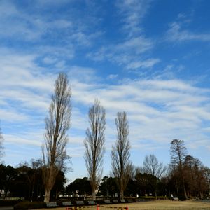 今朝の散歩道です。 青い空と雲☁とポプラ