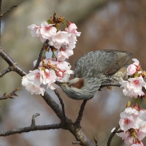 今朝の散歩道です。 桜🌸に鵯 鵯さん、体が柔らかいです。