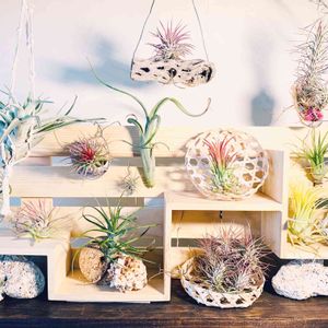 今まではみどり色のしか持ってなかったので昨日買ったものと合わせてエアープランツマンションにしました😆 うちにある貝殻🐚にくくりつけたり 吊り下げたりしましたが ぽん置きのもあります〜 うちにあった緑色の4つは2年くらいいるんですがずっと変わらず花も出ず😩 お水が足りてないのかな〜