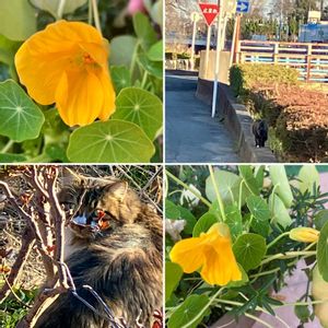 おはようございます٩(๑❛ᴗ❛๑)۶ 昨日は暖かい一日でした♪ 玄関前の鉢植え金蓮花が 咲いて来ました🌼 何年も前からここに🌼 種が出来ると 私が埋めるから〜😉 違う色も欲しいところ😊 散歩してるネコちゃん 止まれって書いてあるヨ! 振り向いて 行ってしまった🥲 2️⃣房咲き水仙八重 川沿いに沢山咲いてました🤍🤍 🏷️にゃんにゃん祭り 参加させていただきますネ