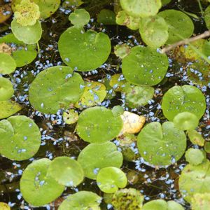 公園の池の一角は浅くなっていて、水草や水際の植物が植えられています。 アサザの葉っぱの隙間に散りばめた青いものは⁇ 岸辺に咲く紫陽花の落花でした💙