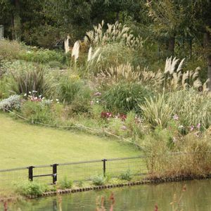 週に1度、散歩に行く公園。 池越に花壇ゾーンを撮ってみました。