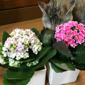 小さな花🌸が可愛かったので連れて帰って来ました(๑˃̵ᴗ˂̵) ミニカランコエ ✨早速、むぎチェックが入りました。多肉ちゃんやから大丈夫かな?