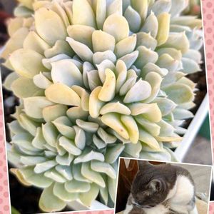 たぶんトップシータービーの綴化✨ リメイク缶教室に参加した時に 多肉バイキングみたいに選べる 中に入ってました。 1年半くらい経ってなかなか趣き深い😃💕 冬厳しく水切りしたので、 葉っぱが黄色いの💦 グルーミング中のモンちゃんで みちのすけさんの🏷ニャンニャン祭り に参加します😺