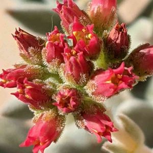 クラッスラ属 メセンブリアンテモイデス (ラージフォーム)の花芽 濃いピンクが可愛いです💕 ワッツ産の子。 下のほうはサビ病で可哀想な姿💦 ボンビシナとかこれとか、兎耳系とか、少しモケモケな子はサビ病にかかりやすいでしょうか😣💦
