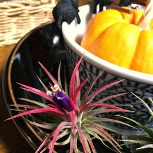 開花期に赤く色づくチランジア。 細かい品種名までは不明😜 真ん中から小さな花が咲き始めました。 何ともビビットな色は、ハロウィンのアレンジにちょうど良い💕 さてと、チランジアも初めてだぞ! 育て方を勉強しないとね。 因みに、カフェベローチェのフチネコ達が大活躍💕 画面には収まらなかったけど、全種類コンプリートだぜ!