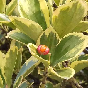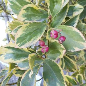 白い縁取りの葉に赤い実がなっています。 これもマサキでしょうか❔