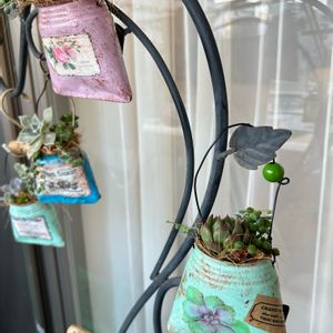 おはようございます。 柵に引っ掛けるブリキの鉢?かな。 これ、斜めになってるから植物を入れても中のブランターが見えてなんか可愛くなかった。。。 そっか、これってこうやって使うもの?と閃いて、多肉ちゃんを植えてみました。 見違えるように可愛くなったんじゃないかしらとまたまた自己満足♪( ◜ω◝و(و " サボテンのピンクがいい仕事してくれてる😁