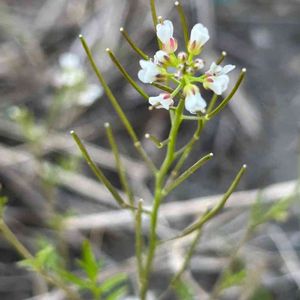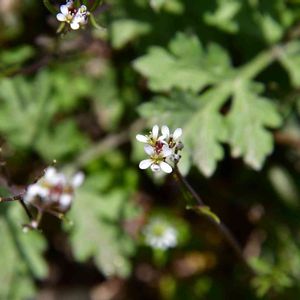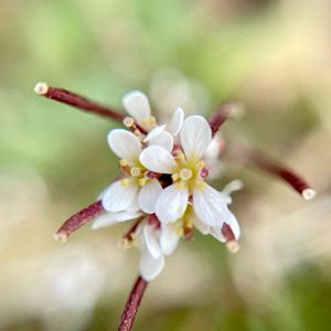 【ミチタネツケバナ(道種漬花)】 ヨーロッパ原産、アブラナ科越年草 近年急速に増えつつある帰化植物。 道端、荒地、芝生など、やや乾燥した場所に生える。 直径 2~3 mm ほどの小さな白い花をつける。 萼片は4枚、花弁は4枚、雄しべは4本。 よく似た近縁の在来種タネツケバナの雄しべは6本。 果実は長さ1~2cmの長角果で直立する。果実の中には多数の種子が並んでいる。 草丈: 5~30 cm 花期:3~4月 花色:白 維新記念公園@山口市