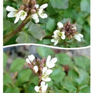 アブラナ科タネツケバナ属 右 タネツケバナ 平地 里山 などの湿った所に生える。 左 ミチタネツケバナ 乾いた所に生える、夏が苦手で少し高い所。 ミチ……が、タネ……より花期が早い。 見分けはタネ……の果実は柄が鈍角に出て立ち上がる、果実の先は花より低い、高い場合でも少しだけ。ミチ……は常に花より高い。名前の由来は種子を弾き飛ばしてどこでも生える等の説があります。
