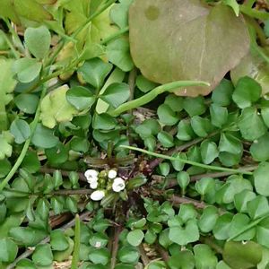 庭にたくさん生えている、 ロゼット状の葉に白い花の植物と 丸い葉っぱだけの植物 なんでしょう?