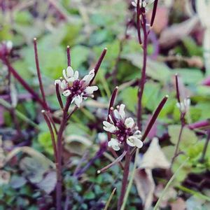 ミチタネツケバナ(道種漬花) 水田や溝の縁に生えるタネツケバナの仲間。 こちらはやや乾燥した場所を好み、畑や街中でも よく見かける。 花はナズナに似る。 種もみを水につけて稲作の準備を始める頃に 咲くので、この名前がついたという。 家の庭の片隅に咲いていました。 稲作の準備をする時期からはまだまだだいぶ早いと思いますが… ・:*:・(*´∀︎`*)・* .:・
