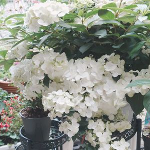 アジサイの大鉢トリオ いつも1番乗りは"ラグランジア・ブライダルシャワー" これは数年前にアンバサダーでいただいた苗木 今ではこんなに立派に育ちました😊✨ 爽やかな白が目を惹きます😆🤍