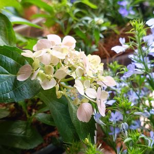 PWラグランジア クリスタルヴェール2ꕤ どうやらピンク寄りのお花が咲き始めました! 去年は青色満開だったので肥料をアルカリ寄りにしてみましたが、このあと青色グラデーションになれるか?😆 花芽つけてる4鉢のうち、2鉢は花芽に水がかかった為かお花傷み(T_T) 根元にお水あげながらも一度花芽がつくのを待ってます 去年の5号株はかなり大きくなったけど(7号鉢に葉っぱ🌿わさわさ)、花芽がつかない! ふと思ったのは、秋〜冬越しの間に伸びてた枝が結構パキパキ折れたんですよね〜〜 花芽ごと折れてたかも💦 今年はこのまませっせと🌿葉っぱ(株)育てる事になるかも?!
