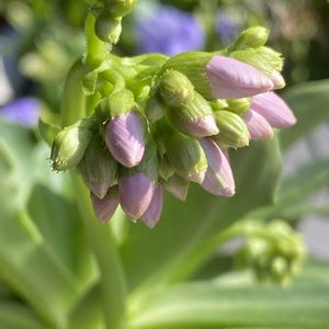こんにちは♪😃 暖かい日になりました。 レウィシア さん だいぶ蕾が大きくなって来ました♪🎶 明日か明後日には一つくらい開きそう💓💗💕 後ろの紫💜💙💜💙青はトレニアのブルーリバーさんです〜