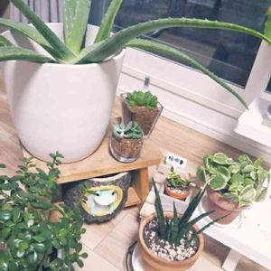 多肉ちゃんたち✨Σp[【◎】]ω・´)パシャッ! カエルの中には春🌸に綺麗に咲いてくれたチューリップの球根ッ!😜✨ #金のなる木 #サンセベリア #ペペロミア #アロエベラ #桜吹雪 #みどり牡丹 #桃美人 #京の華