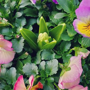ダブルデッカー植にしています ビオラ&アッサムの下から チューリップとヒヤシンスが2cm位の芽を出していました