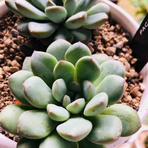この多肉ちゃんの名前はなんでしょうか?リトルビューティ? かわいいのに名前忘れちゃった… ポイントは、ぷっくり系です!