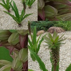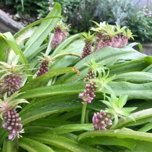 ■Eucomis vandermerwei ・ユーコミス バンデルメルウェイ 花も終盤のバンデルメルウェイと花がこれからの品種不明の名もないユーコミス。パイナップルリリーの名のごとく、パイナップルみたいなお花です🍍
