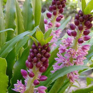 今朝の庭☀️ パイナップルリリー🍍 矮性のピンクの花が咲き始めました ☆⌒(*^∇゜)v