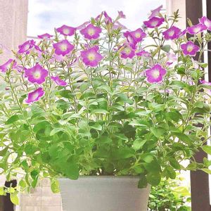 サフィニアアート いちごシェイク💓 こんにちは🎶 少し晴れ間が出てきました☀️ 2回目切り戻し後のいちごシェイクさんです。 満開ではないけれど結構咲きそろってきたので撮ってみました♪ 庭側の園芸ボックスの上に乗せてお空と一緒に💓
