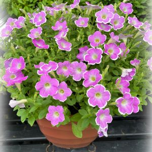 おはようございます😁 サフィニアアート・いちごシェイク ペチュニア ギュギュ・ピンクアイス : 暑さに耐えて咲いてます 😍🌸