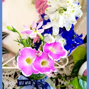 今日も小雨🌂 毎日お日さまの見えない日が続いて、雨粒で花びらがシミになり、すぐに傷んでしまいます😢 今年のお花は長く咲くのが難しいようです💦 少し✂️して挿して玄関に置きました💐 サフィニアアートいちごシェイク デルフィニウムサマーナイト デルフィニウムサマースター ローレンティア フィズアンドポップ バニーピンク どのお花も名前が長ーい🌀😅