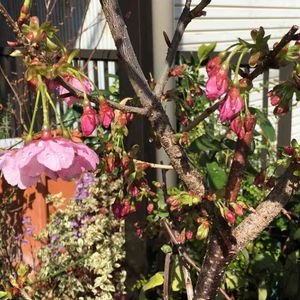 おはようございます🌞 3/18大阪11℃快晴 玄関の 🌸可愛いピンク色のお花💗 桜(陽光)🌸が咲きました💕 まだまだ小さな木ですが🎶 我が家の開花桜💕蕾が沢山🎶 大きめのコンテナに植えてますが 今後、根詰まりに要注意ですね コロナ禍でも素敵な桜🌸です😍