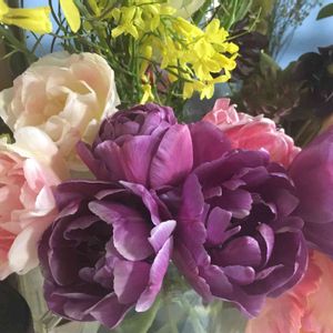 おはようございます😃4/11 大阪13℃快晴 紫色💜の お花💜薔薇の様なお花💜 チューリップ🌷🌷🌷🌷🌷 素敵な色合い💜の 可愛いお花です😍