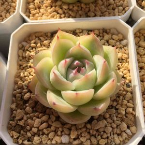 カルテ№205 エケベリア属 ウォーターリリー🌱 ド真ん中の日🏷に参加します🎶 ⬆️可愛い「ド真ん中」でしょう🤩 交配式は公表されてないですけど、これは!このカッパ口(•Ӫ•)は!きっとエレガンス入っとるでしょう!😆 2018年の4月にGS友から幾つか送ってもらった子の中に入れてくれてた子です😊 すぐに1号プラポットに植え付けて、明るい日陰で1週間、うちよりちょっぴり気温の低いところから届いた子だったんで、温度差と紫外線に慣らすためにさらに1週間の慣らし保育の後、我が家にいる他の子たちと同じ環境で育て始めました🌱 大好きなんで、既に我が家に大人な子が居たんで「早く追いつけ~、追い越せ~!」と育ててきました😆1号→2号→2.5号→3号(プレステラ90)とひと回りずつ鉢増ししながら、今は3.5号(プレステラ105)に入ってます🎵 ウォーターリリーのタグ🏷で育ててますけど、暫定の学名は「スリョン」。和名が「睡蓮」なんでウォーターリリーで売られてるんでしょうけど、ウォーターリリーはアガボ系の交配種に使われてる学名なんで、この子に使っちゃあダメなようです🤔 お迎えした時の名前でタグ🏷付けしてるんですけど、今年はこの辺りもできるだけ学名に変えて行こうと思ってます👍 あ!忘れてました!下の2つは友情出演のアリエルとクリスタルローズです🤭💕 。* ❤︎… 今日のひと言 …❤︎*。 体に見合った大きさの鉢に丁寧に鉢増ししていくと綺麗に育ちます☝️ 「たっちんのウォーターリリー」タグをタップでこの子の生長記録のみどりのまとめが簡単に見れます😊🎵