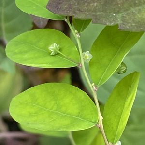 葉っぱの上に白い丸いものが乗ってると思って撮ったら小さなお花でした😊 不思議なお花の付き方です🎶