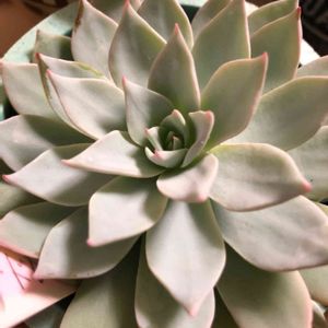 こんばんは🤗今日は午後から雨はあがりましたが🌂お日様は顔を見せてくれませんでした🌥 出窓組の多肉さんの中で唯一徒長しないでいてくれるプラチナドレスさん👗ふちがピンクで可愛い💕頑張れ