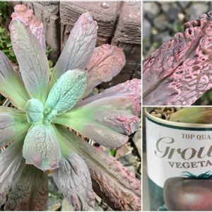 瘤エケさんのバロンボールド❣️ 、を植えたDAISOのトマト缶も紫外線でいい感じに変色中。 ウーンウーン (Θ_Θ;) 葉っぱ、もっとコンパクトに育ってほしかったなぁ… 😑水多かったんかなぁ…😑陽当たりかなぁ…😑わからんなぁ… 皆さんのエケさんも葉っぱが巨大化⁈というか長〜く育ってしまうことありませんか⁇自分は、時々こんな感じに葉長な子、作っちゃいます😅