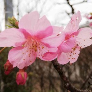 昨日の河津桜🌸☁ ご近所さんのお庭から🤗 花友のお母さんと待ちに待ってた開花、もう1枚で🙏💕 青空だと…良かったのになぁ〜。午後から晴れた☁→☀昨日Picでした😅💦