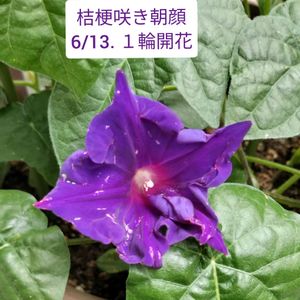 6/13㈭② ついに開花しましたー‼ 桔梗咲き朝顔😄 紫色が一番乗り💜 良かった〜紫色を間引き過ぎてたらどうしようと思ってました😆 青い花を育てよう!ではない事になってしまいますからね〜😅 ひと安心です。傷ついてる花びらも愛おしいです😍💜 4月から2ヶ月ちょっとかかりました。 亜麻が終わってから咲き始めるなんて、律儀に順番待ち?🤭 新しい楽しみが増えました。 蕾に気づかなかったわ😂 もっとよく観察しないと… 成長記録、まとめますね☺️🌱 桔梗咲き朝顔 撮影回数…後で追記します←12回目 自宅ベランダ.鉢植え 6/13.紫色の花が1輪開花.