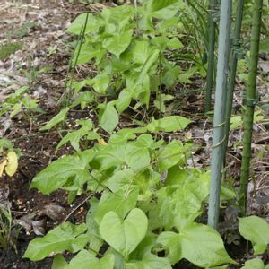 「青いアサガオ」 🏷チーム・ブルー◆青い花を育てよう! 「その2回目」 前回の報告が、約1ヶ月前あれから葉っぱが増えて、手前方のツルがあっと言う間に伸び、支柱に巻き付いて来ました。ここの所、日中は暑いので出来るだけ早朝に水やりはしていますが、直ぐに地面がパサパサに乾燥してしまいます。