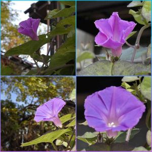 「琉球朝顔💙」41回目 〜オーシャンブルー〜 (47.48.49.50番花) 前回、お花たちが咲いたのは10/24のこと。久しぶりに昨日咲いて来ました。😉 *pics.左上から、6時30分頃の咲き始めの様子から昼頃までを追って。 *右側pic.→支柱の一番上の子は、早朝からずっと咲いていました。 🏷咲き始めのお花たち(No.118) 🏷チーム・ブルー◆青い花を育てよう!