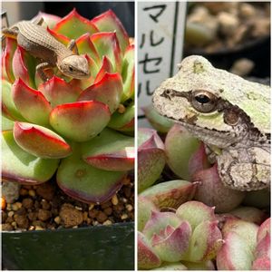 アエオニウムの保険株の寄植え?みんな小さい苗なので纏めて植えてみました♪ 2週間前に作った時にはみんなギューッと閉じて土も目立っていましたが、それぞれ開いてだんだんと隠れて来ました😊 グリーノビアはもっと開くはず、どんな感じになるか分かりませんが鉢減らしを兼ねて作りました❢ 今日はデザートローズに挟まった 🐸くんを見つけました😆ミルフィーユ?