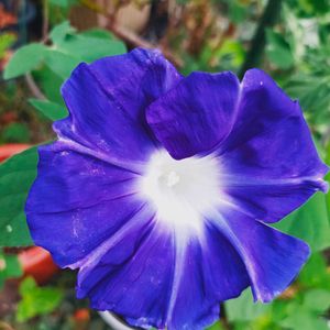 朝顔の松風が咲きました♪ 群青色のステキな朝顔です。 ピンクは100均の垣根用朝顔です。 🏷青い花マニア、初参加させて頂きます🔷🔹🔹🔹 ハイビスカスをお宿にしている アマガエルちゃん💚 カメラ目線です🤭