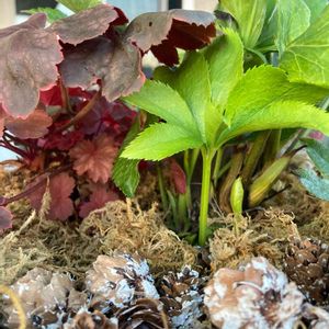 3/2 6/2 投稿の クリスマスローズ& ヒューケラのハンギング🌿 順調です🤗 クリスマスローズの新しい葉がグングン伸びてきました ヒューケラの新しい赤い葉の赤ちゃんもいっぱい😆👍 あー 松ぼっくりを置いてる場所に植えてた可愛いフクシアプーニーちゃんは真夏に1日水やり忘れで枯らしてしまった😂 残念💦 ゴメンね、プーニーちゃん💓