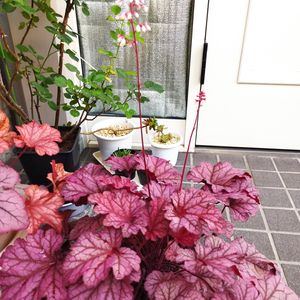 ヒューケラ 勝手口ドアを開けるとヒューケラのはなが咲いています お隣さんのはなちゃんが私の事?って、のぞいてくれます。 U^ェ^U