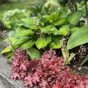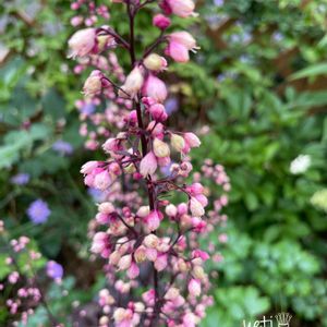 ヒューケラの可愛らしいお花が咲いています🩷 わが家の小さなお庭 日陰の小さな花壇に、 2種類のヒューケラを植えました🌿 この色のヒューケラが、のびのびと育っています 奥には、ギボウシの花芽も伸びてきてます🤍💚