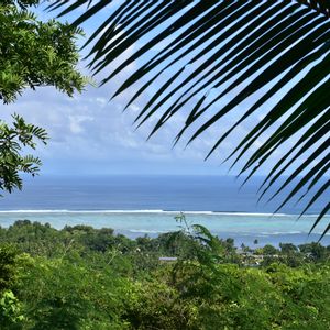 おはようございます。🐦 ヤシの葉陰から覗くのは本島東海岸。 リーフの切れ目に白波が立っています。 海岸沿いの集落も見えますね。 今日も良い一日を! 💙