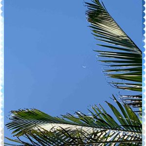 こんばんは🌙.*・.。*・.。* 青空に椰子の葉が映えるなぁとパチリ🤳 見ると白い月がニッコリ(*˘︶˘*).:*🌙𖤐⡱ ・.。*・.。*( ・∀・) イイネ!🌴🌙𖤐⡱・.。*・.。*