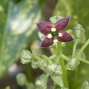 雌雄異株 直径1cmほどの花 赤紫色 紫褐色の小さな4弁花 (チョコレート色の地味な花) 青木の花(あおき) アオキ科(ガリア科)