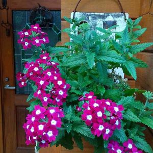 玄関わきにあるバーベナ🌼✨ 切り戻しがヘタで、頭が重くなりこんな感じになってますが、これはこれで良いかな😅