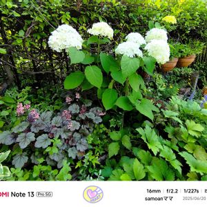 南側駐車場横 枕木花壇 ヒューケラドルチェ🌿 斑入りツルニチニチソウ🌿など それぞれの色・模様・形 大好きな葉物達 梅雨時の緑は美しい〜 アジサイアナベル❁🤍 ⚠️フェンスに絡むのは、テイカカズラ 春に白いお花を咲かせます キョウチクトウ科蔓性植物 切りなく増殖 しかも、有毒植物 知らずに植えたので、 後悔先に立たず・・・・・ 皆さん植えないように。