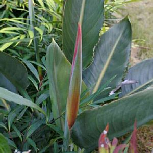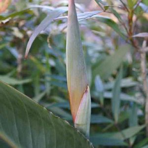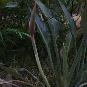 朝の日課になりそうな 極楽鳥花の、花穂の観察 4~5本あるうちの一本 ちょっと角度がついてきました。 2番目に咲くと思う。